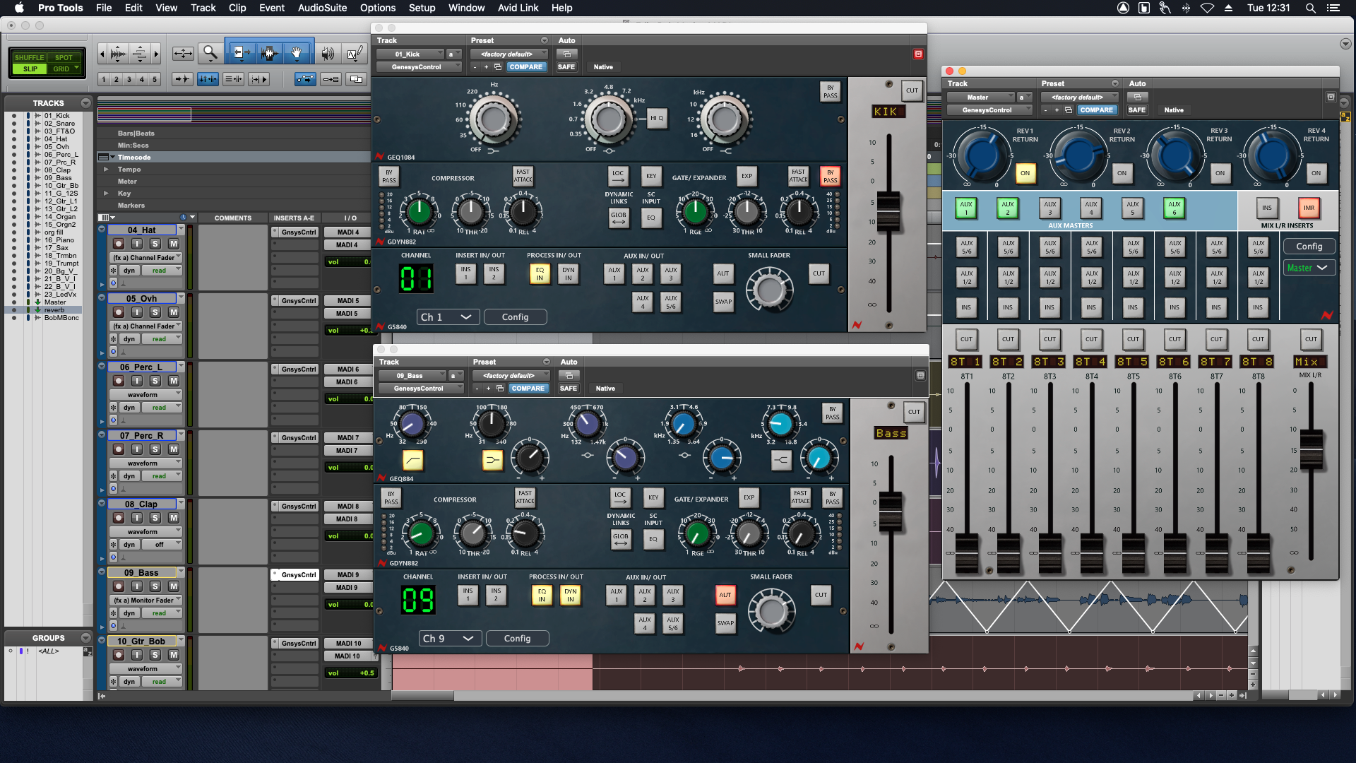 The Genesys Control plugin has two user interfaces. When applied as a master plugin, the GUI displays the master section of the console, enabling automation of many parameters, including fader and cut automation of the 8T group faders.