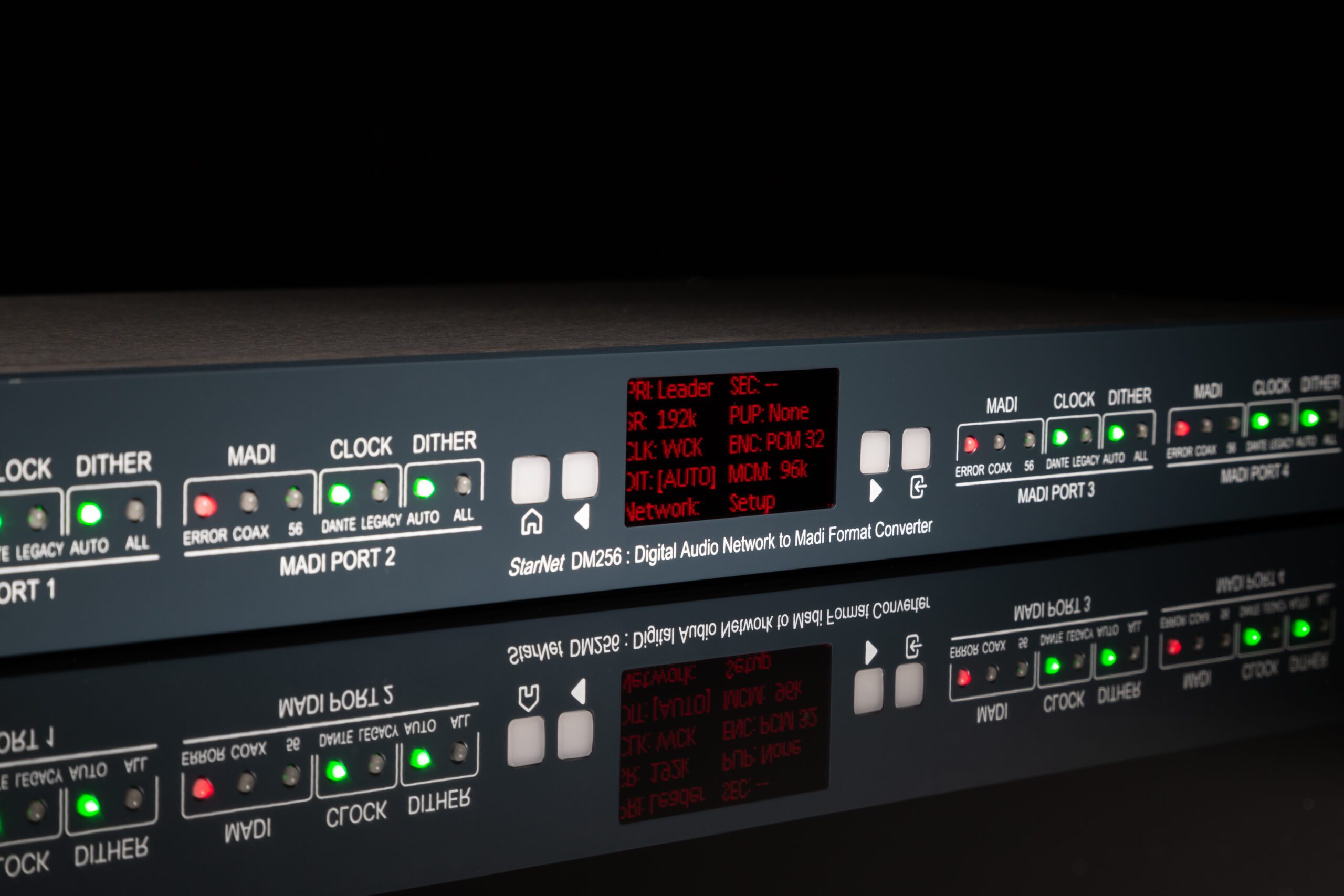 Boasting one of the largest digital I/O counts on the market, the StarNet DM256 accommodates 256 channels of MADI IN/MADI OUT across four MADI ports. These ports feature duplex MADI SC optical connections and dual-BNC coaxial connections, meeting and exceeding professional MADI standards outlined by the Audio Engineering Society.